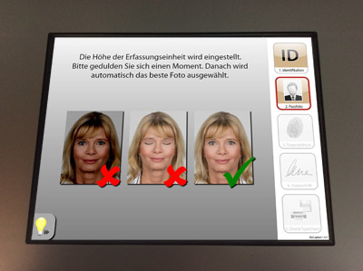 BioCapture wurde so konzipiert, dass das Selbstbedienungsterminal auch von Computer-Laien problemlos bedient werden kann. Die Bedienung erfolgt in einfachen, leicht nachzuvollziehenden Schritten, die durchgängig von großflächigen Symbolen, Bildern oder animierten Sequenzen begleitet werden – auf Wunsch auch mit mehrsprachigen akustischen Anweisungen. Damit ist die Nutzung des Terminals auch für Sehbehinderte möglich. Und wenn es wirklich nicht mehr weitergehen sollte, kann das Personal des Einwohnermeldeamts über einen erweiterten Operatormodus helfend zur Seite stehen.
